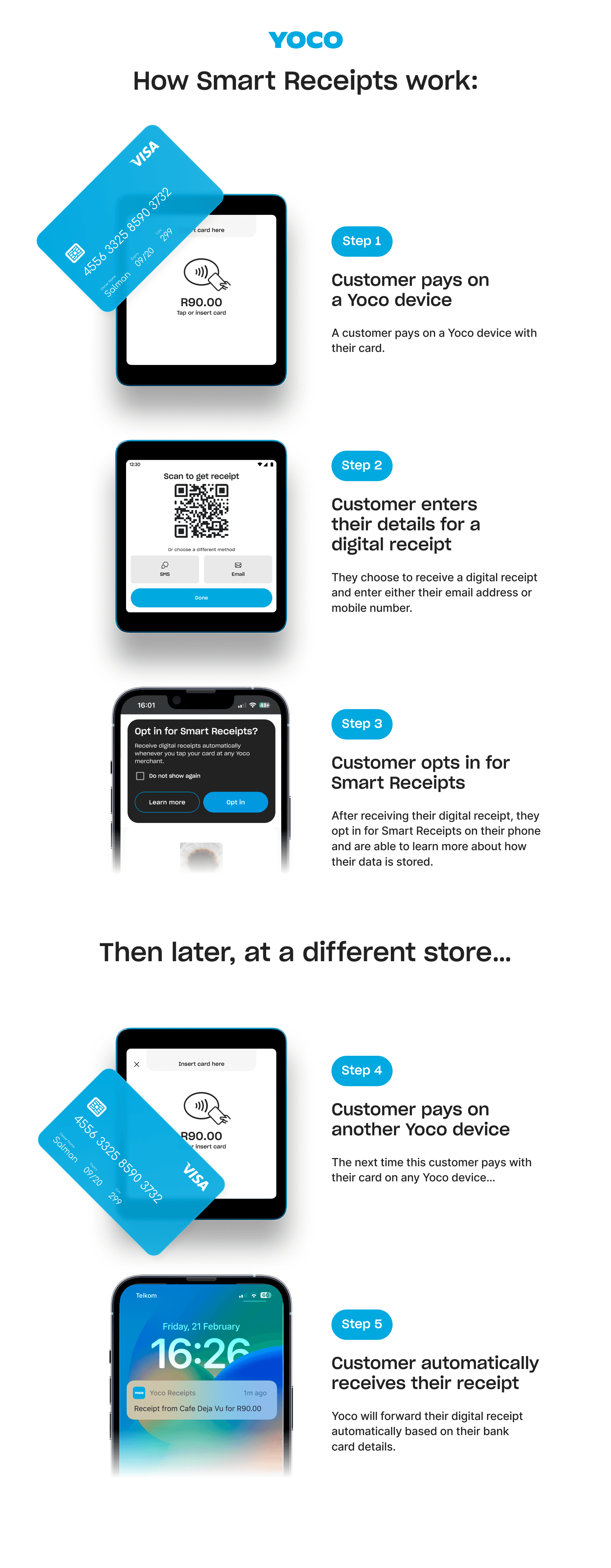 Now, once they’ve done this, every time they pay, on any Yoco device, anywhere, their receipt is sent automatically. No re-entering details. No paper. No delays. Ever again.