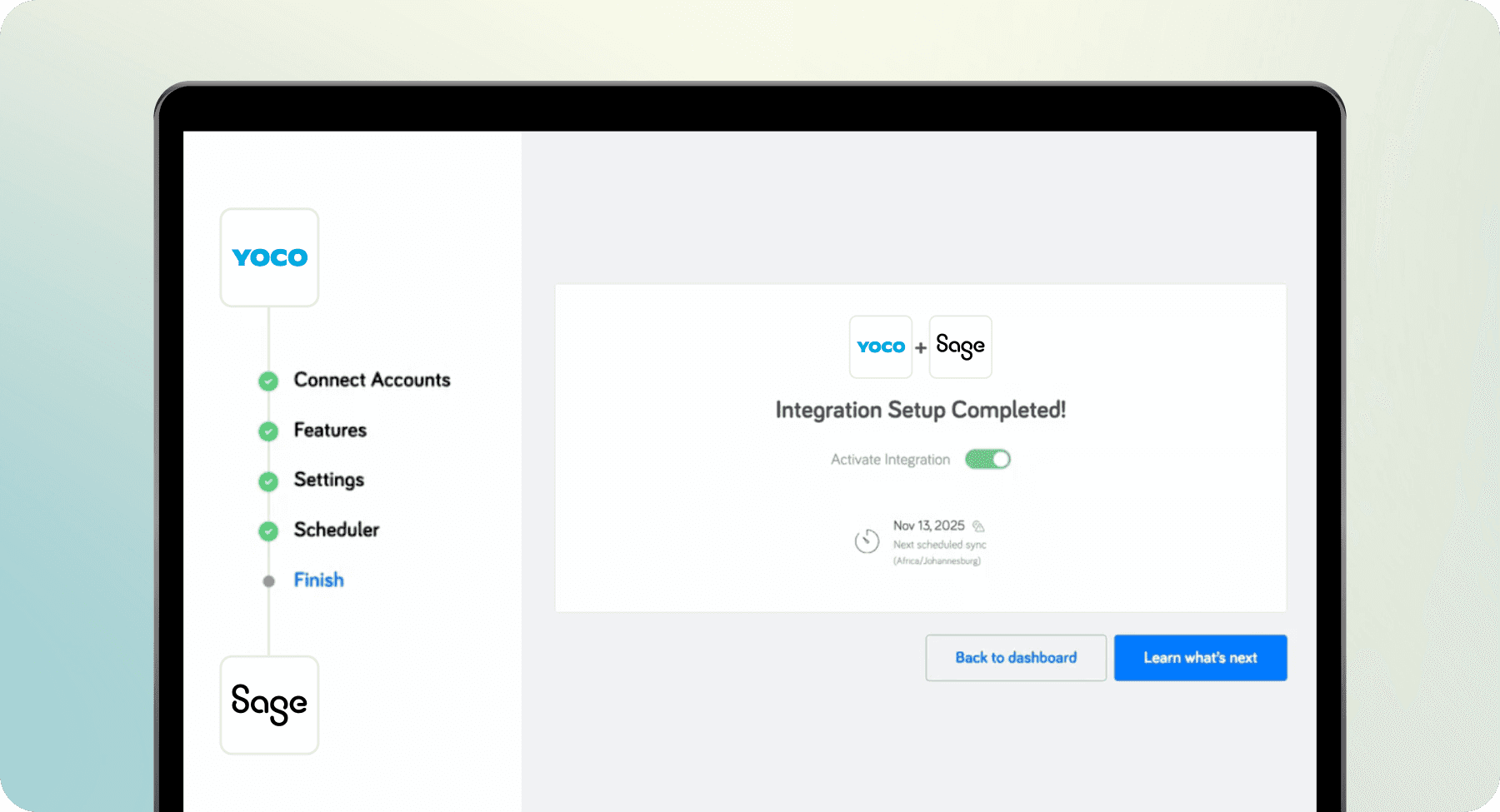 Your daily Yoco sales sync automatically into Sage, with no manual capture, reducing errors through automation, and keeping your books accurate. Clean data, every day, zero manual work.