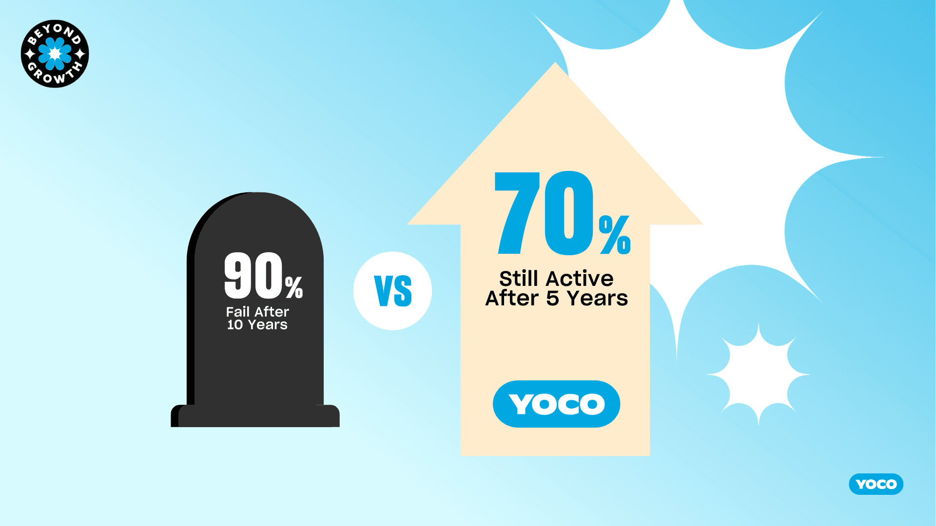This longevity is significant in a country where approximately 90% of small businesses fail over ten years. Within that original group, 23.4% still trade daily and 31% continue to trade monthly. Across our broader merchant base, 90% of businesses survive their first year with Yoco, and 70% are still active with us after five years.