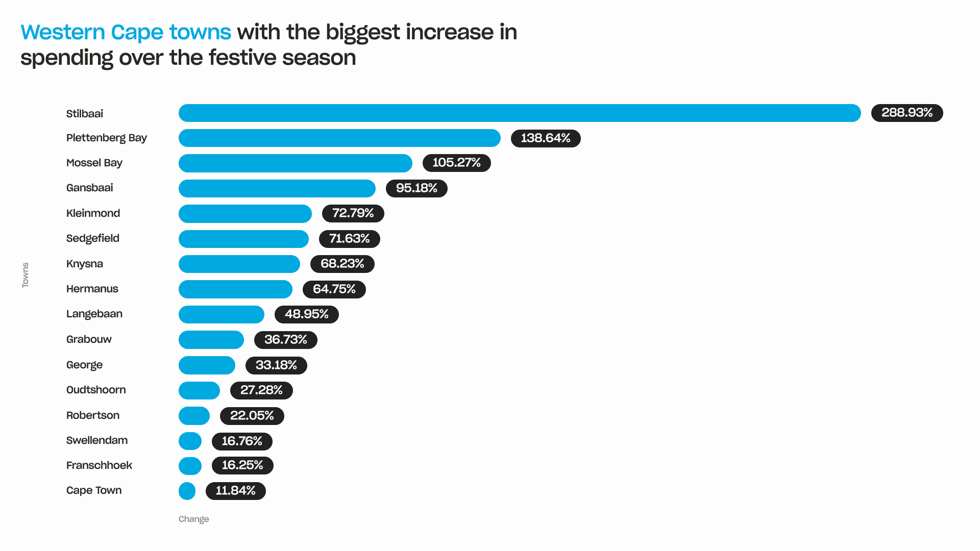 Kenton-on-Sea saw the country’s biggest overall increase with merchants processing transactions worth 437% more than they did in November. Stilbaai led the Western Cape with a 289% increase.
