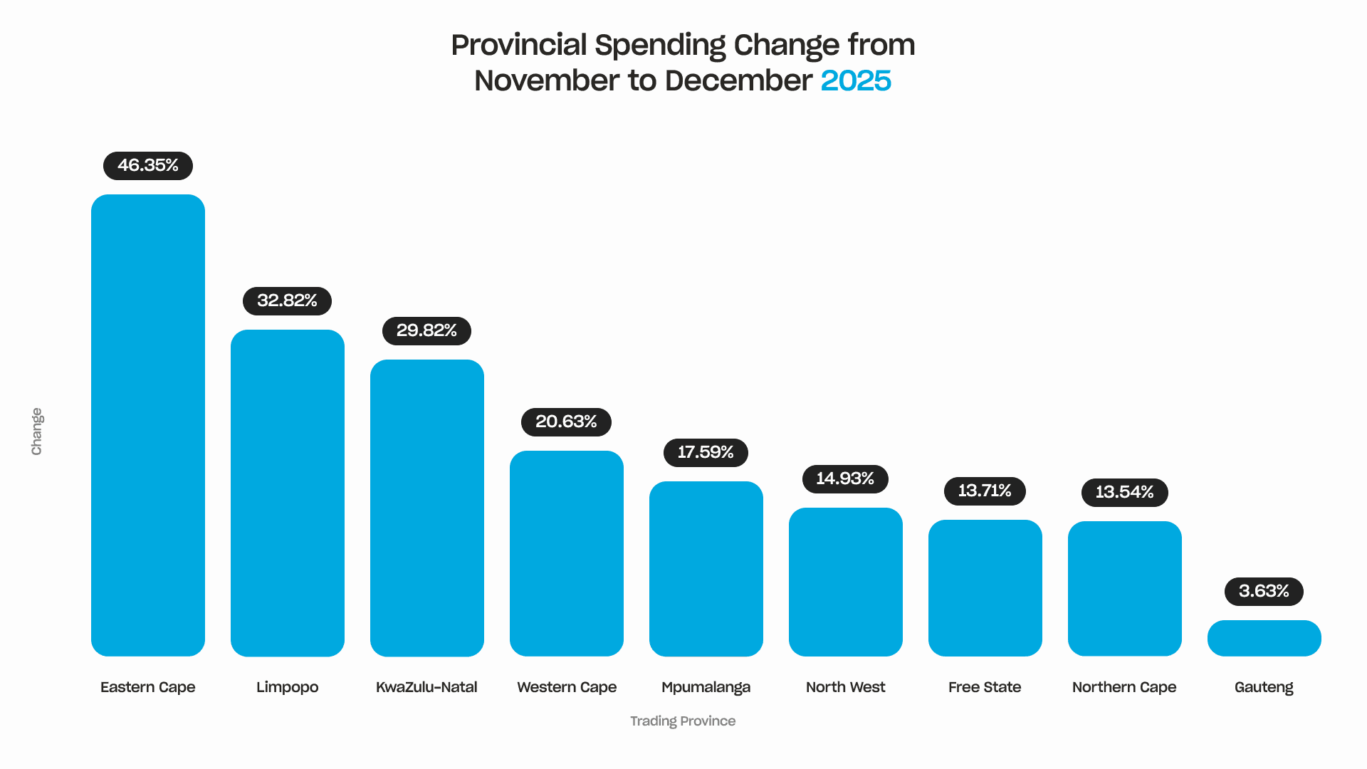 In the Western Cape, the festive season and domestic travellers add a meaningful boost to the province, but it is not the dominant driver of spending in the same way it is for more seasonal provinces. It sees a smaller increase of about 20% over this same period, largely because the province already starts from a much higher spending base in November.