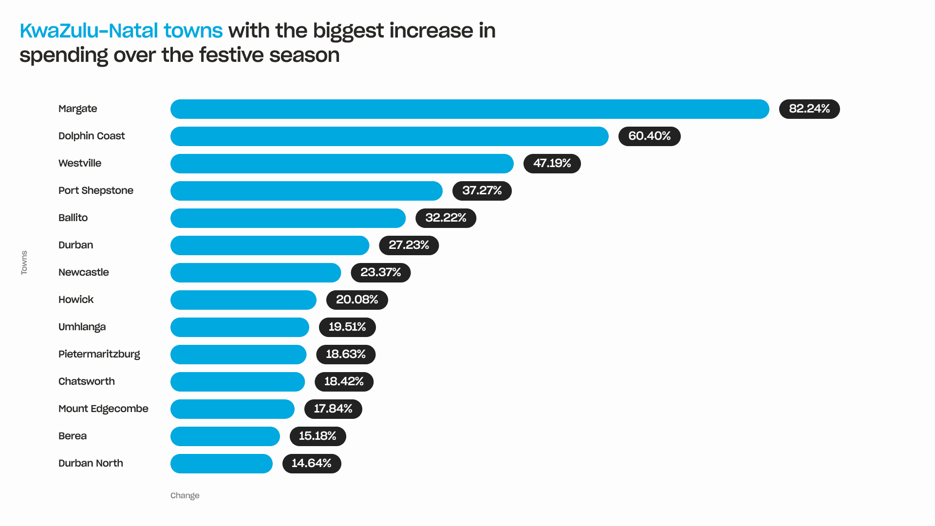 On KZN’s South Coast, Margate saw the province’s biggest spending increase at 82%. Another South Coast town, Port Shepstone, had the fourth biggest increase with 37%