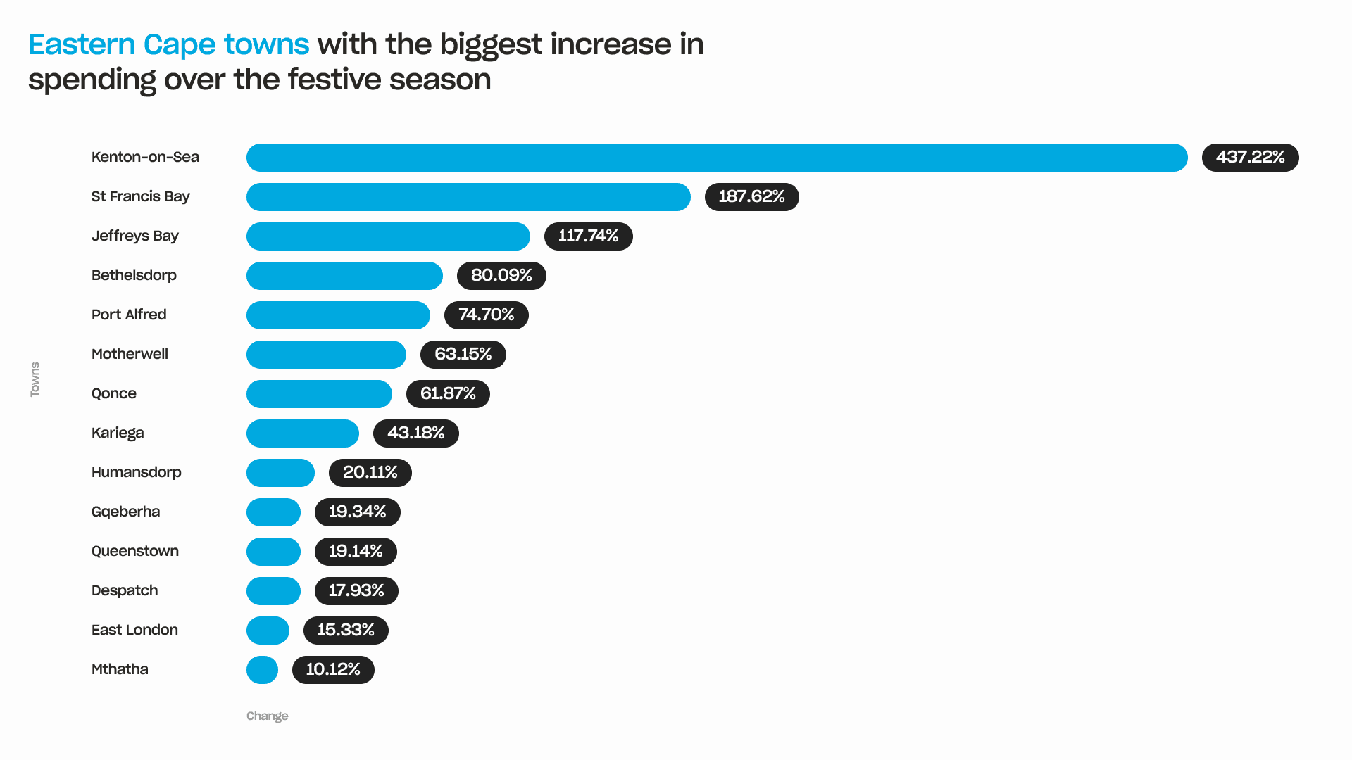 While provincial trends are important, the most dramatic festive effects appear at a town level, particularly in small coastal destinations. The towns with the largest November-to-December increases are concentrated almost entirely in the Eastern Cape and Western Cape.