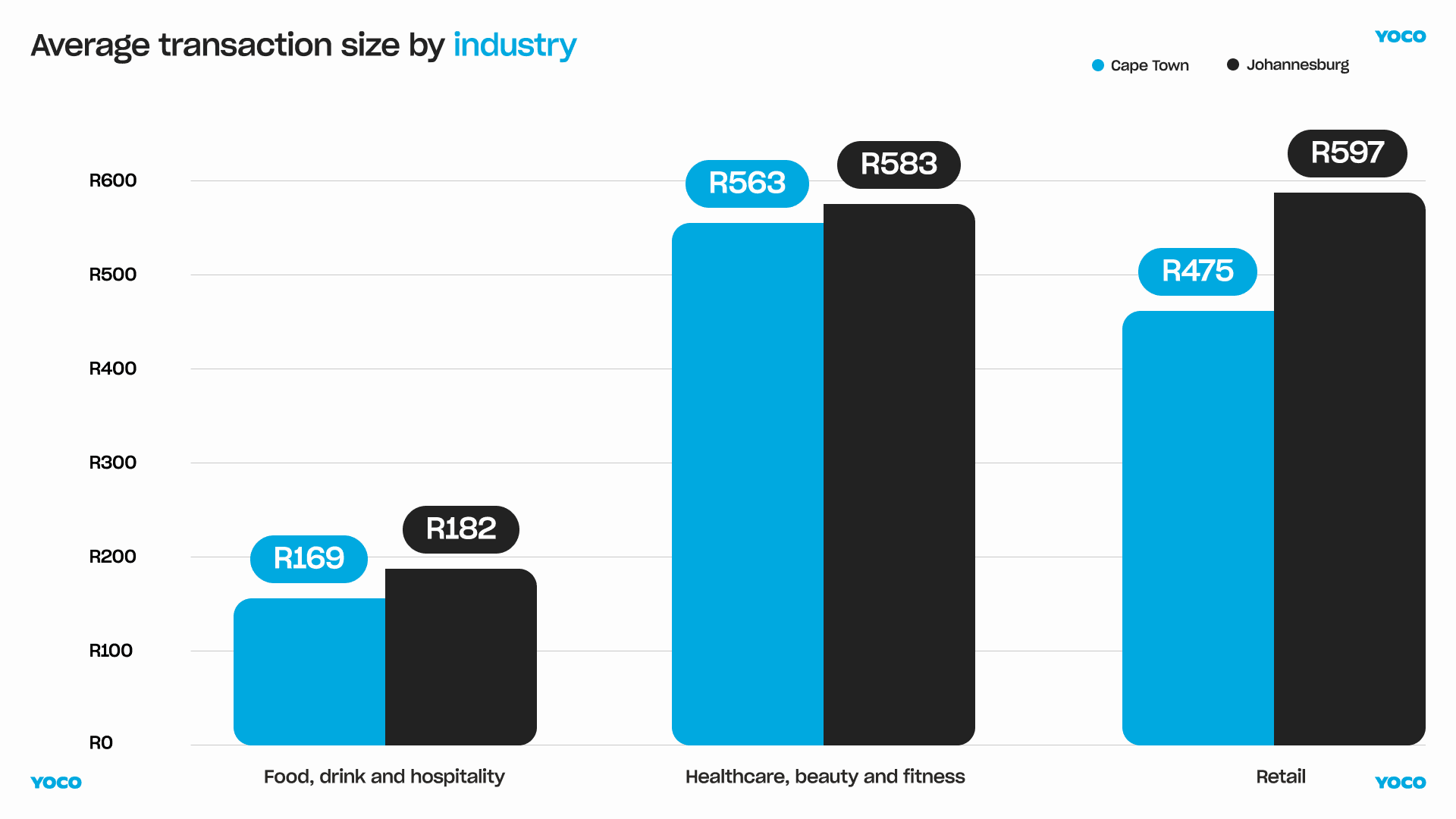 Johannesburg’s greater spending power is also evidenced in the wide gap between retail spending between the two cities. Johannesburg’s average transaction value is more than 20% higher than Cape Town’s.