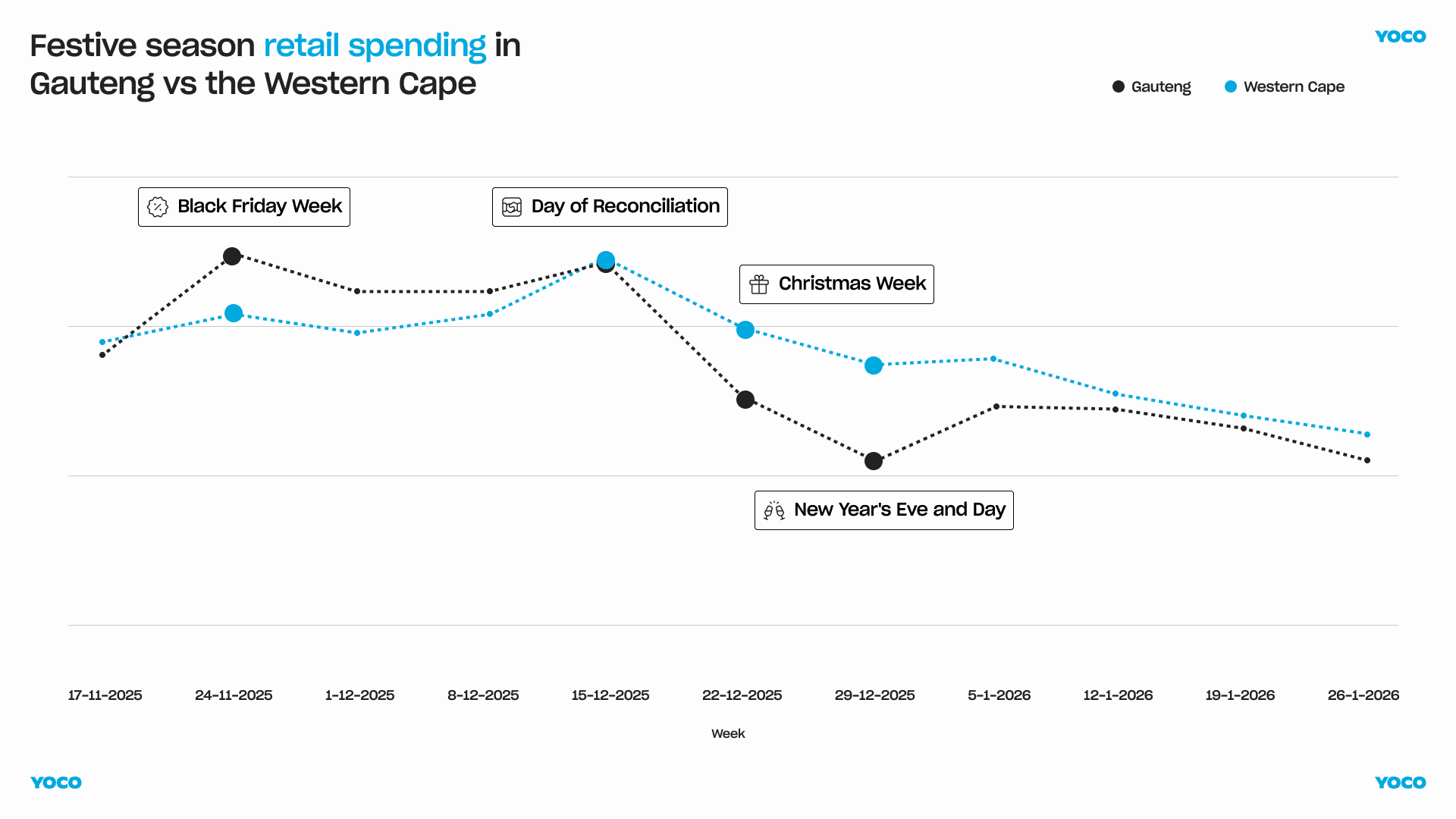 Using local, in-person transaction data from over 200,000 Yoco merchants nationwide, this report breaks the festive period into its underlying phases. We begin in Gauteng, where the season starts, and track how spending redistributes as December unfolds across provinces, industries, and cities.