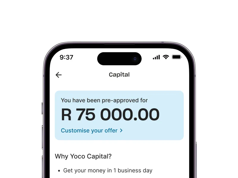 Yoco Capital uses your payments data to offer you a cash advance after 3 months of using Yoco.